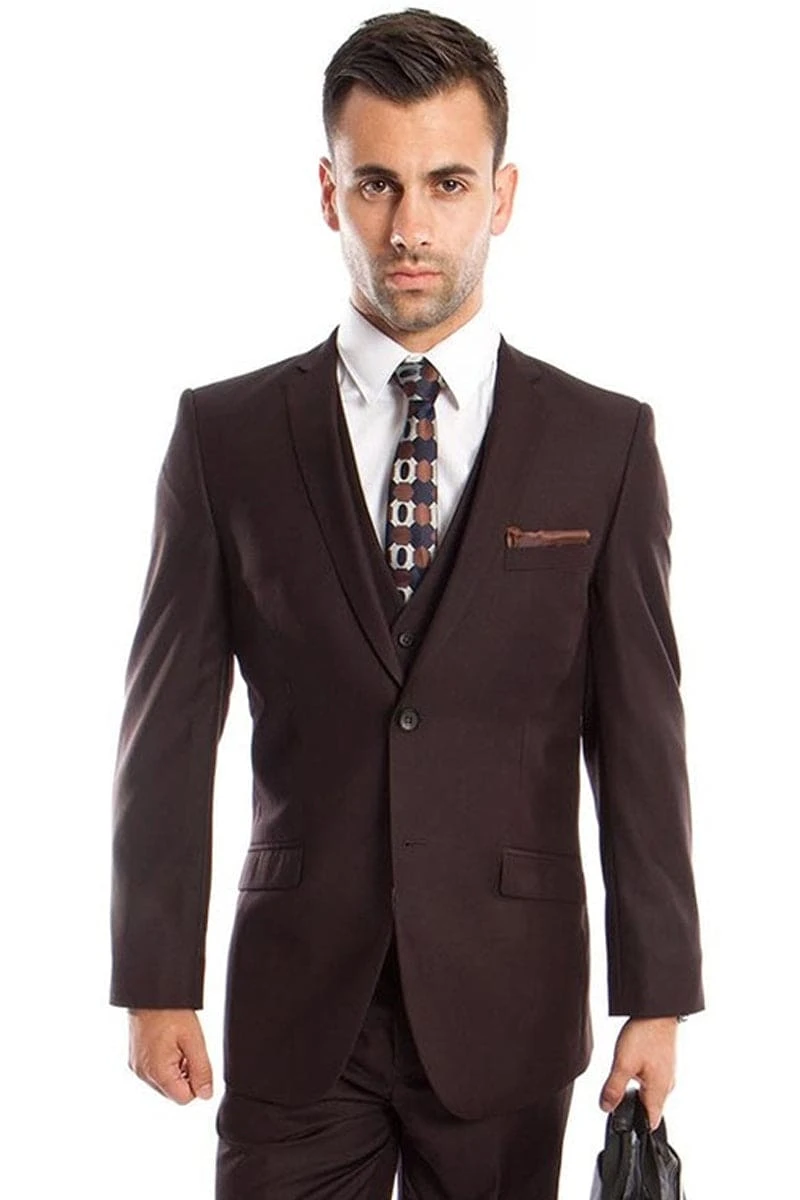 This three-piece suit set is the perfect combination of style, comfort, and versatility. The slim fit jacket features a two-summary front closure, slim notch lapel, side vents, interior French facing, two besom front pockets with flap closure, three interior pockets, and underarm sweat guards for comfort. The five-summary closure vest provides a sleek look, while the flat-front pants are lined to the knee with two back besom pockets with summary closure, two front angled slip pockets,