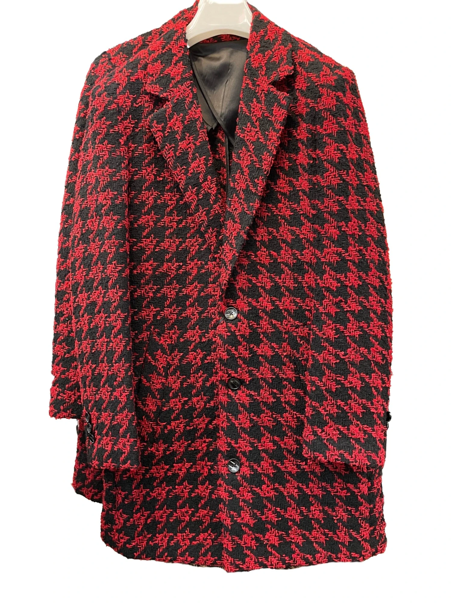 Red & Black Houndstooth Tweed Sport Jacket is a bold and stylish piece that combines timeless elegance with modern flair. The structured silhouette features classic lapels, summary closures, and a half lined interior for comfort.