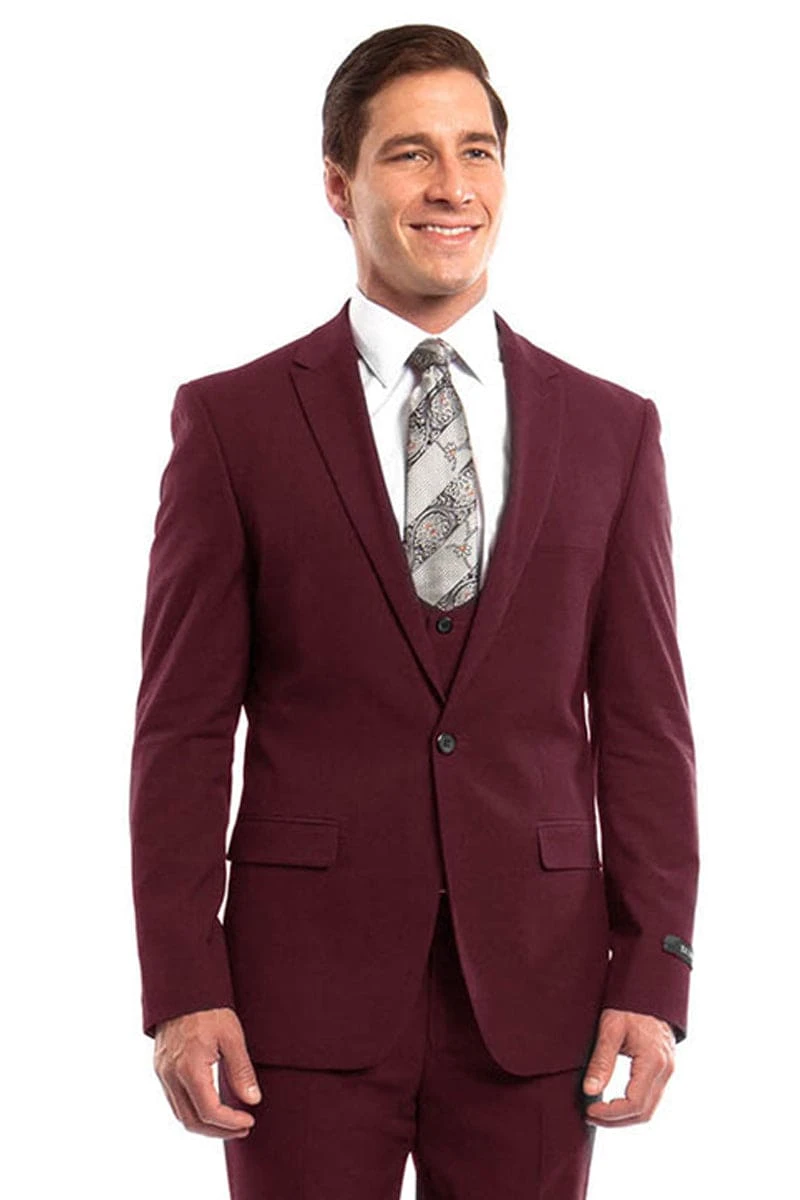 “Burgundy Men’s Wedding & Prom 2025 Suit – One Button, Peak Lapel, Skinny Fit With Lowcut Vest”