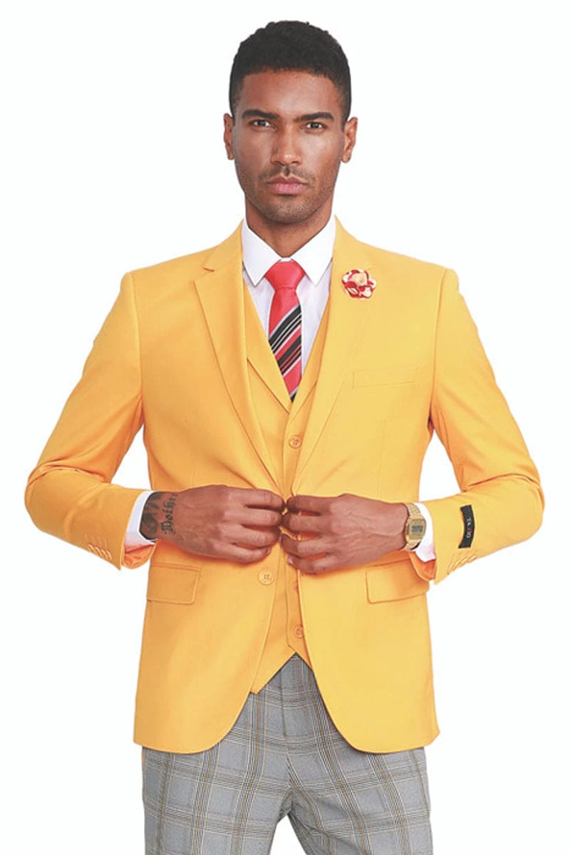 “Canary Yellow Men’s Summer Suit With Two Button Vest & Plaid Pants”