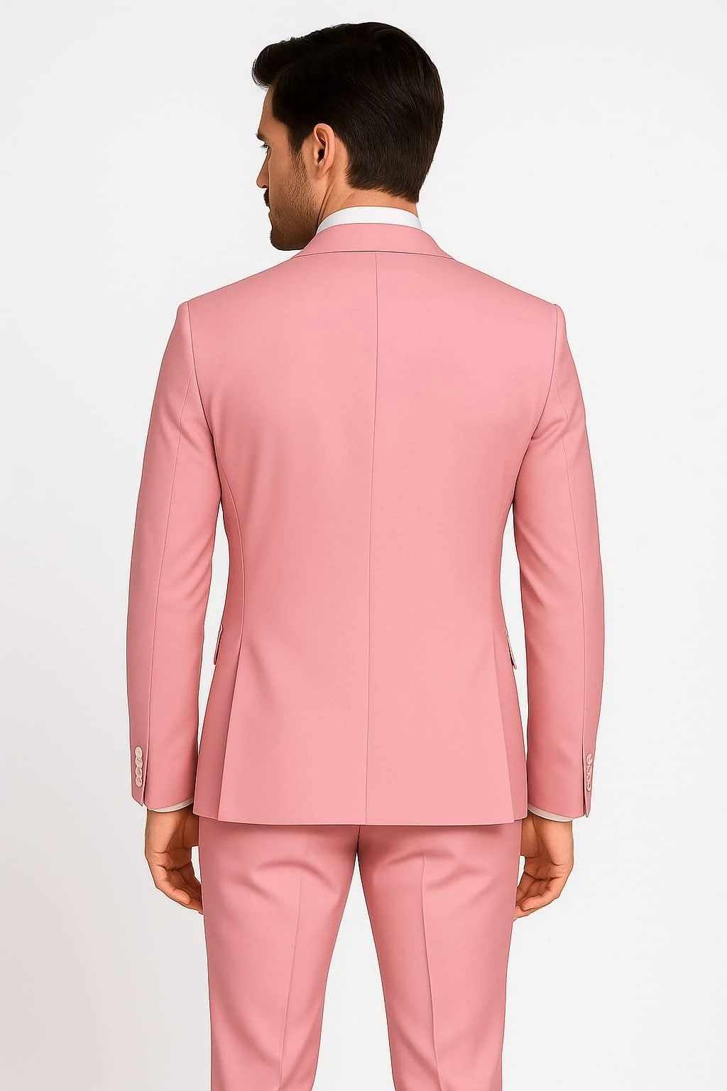 Make a bold yet refined statement in this dusty rose pink tuxedo suit for men, designed to bring a unique and polished charm to weddings, proms, and formal occasions. The smooth satin shawl lapel offers a sleek contrast against the matte pink fabric, creating a visually appealing and fashion-forward ensemble.