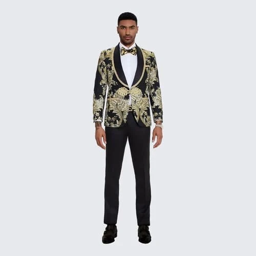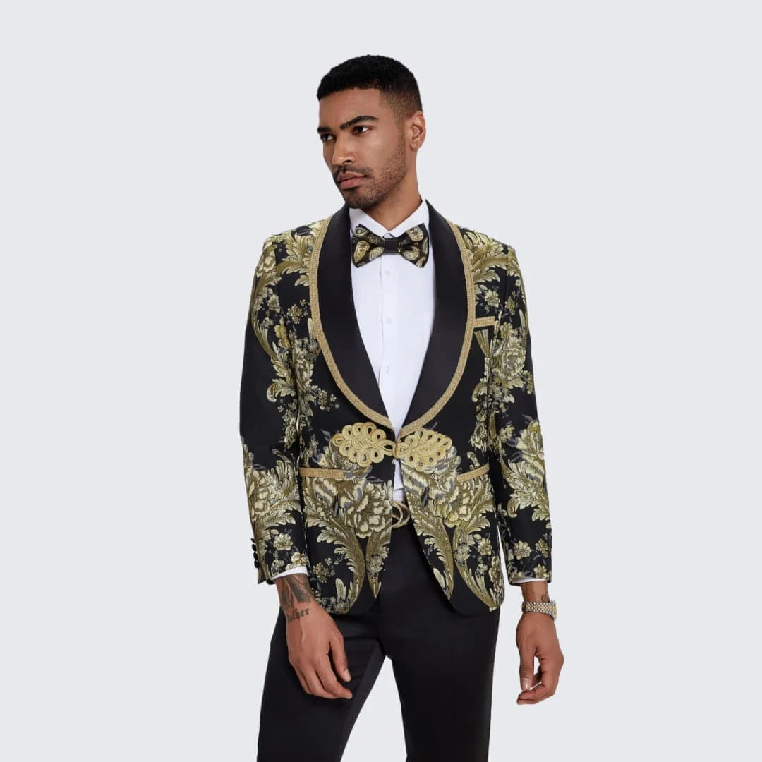 Gold Suit For Prom – Gold Blazer + Matching Pants + Men’s Black Tuxedo With Gold Textured Paisley Design- Wedding – Prom