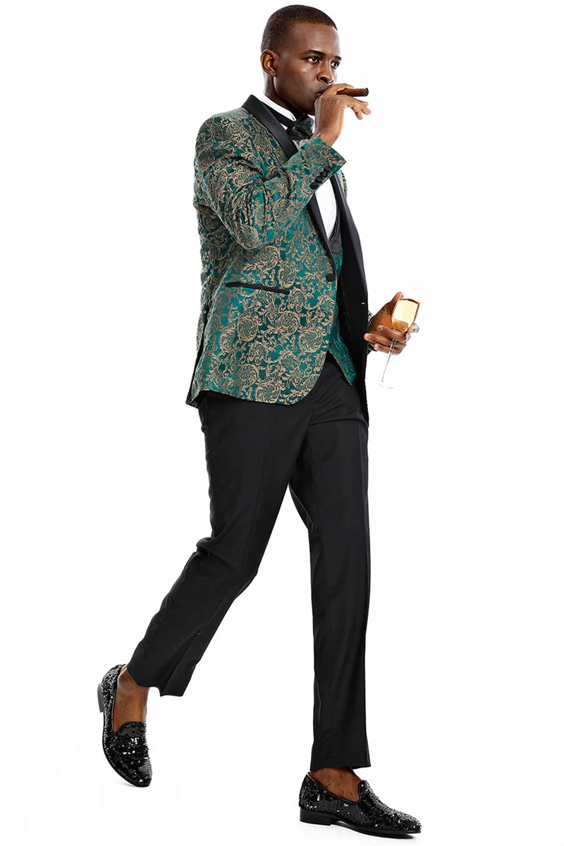 “Green & Gold Paisley Men’s One Button Vested Shawl Tuxedo For Prom 2025 & Wedding”