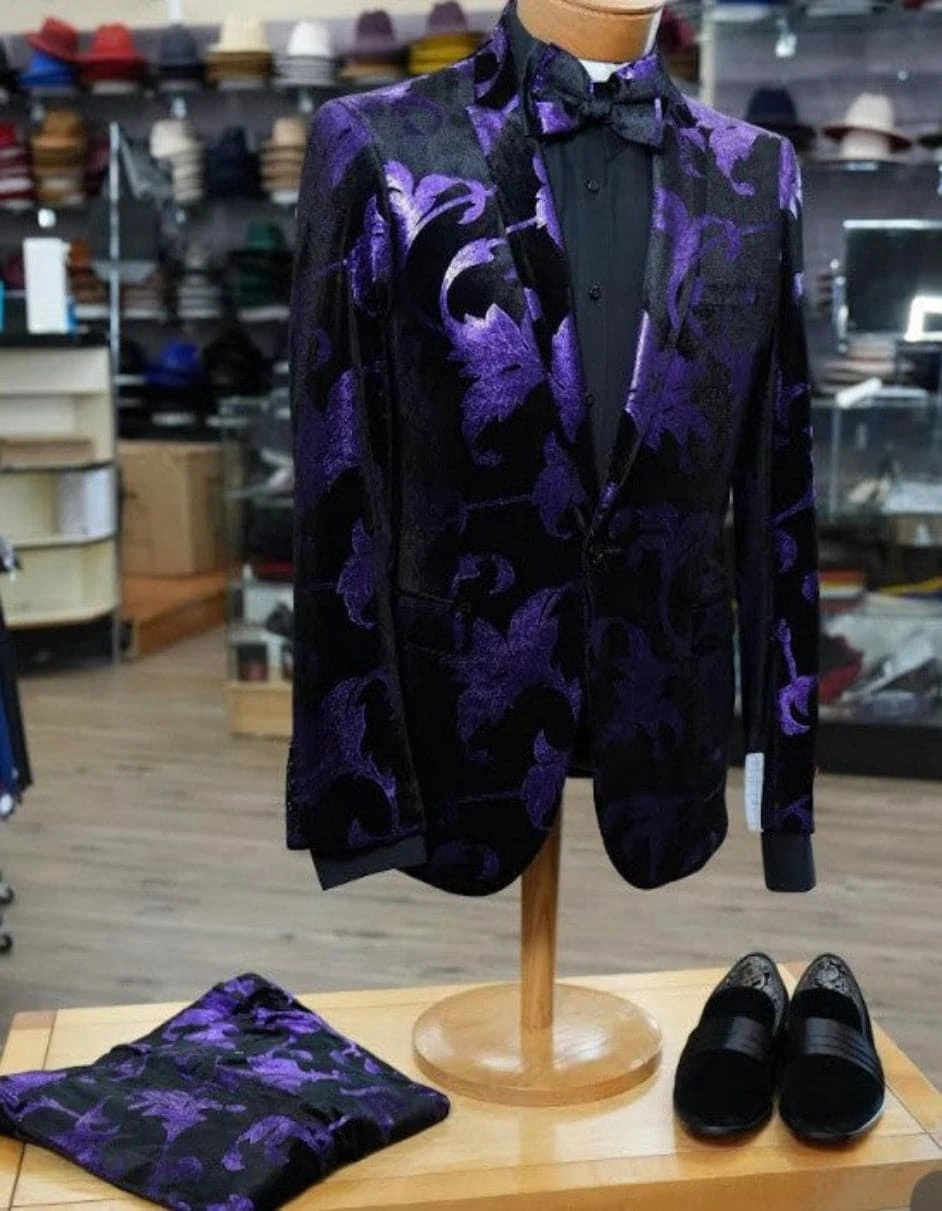 Mardi Gras Suit – Purple And Black Paisley Tuxedo Dinner Jacket + Matching Pants – Slim Fitted