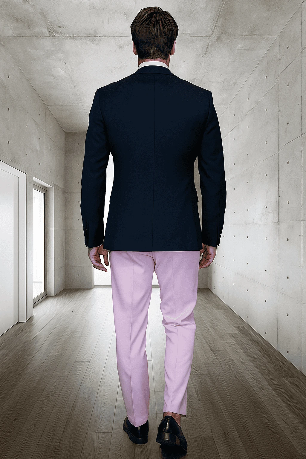 Stand out in style with this modern-fit men’s tuxedo, crafted from premium wool in a sleek black and pink color combination. Featuring a bold contrast satin peak lapel, single-summary closure, side vents, and a matching satin vest, this designer tuxedo includes flat-front pants that complete the sharp, coordinated look—perfect for weddings, proms, and formal events.
