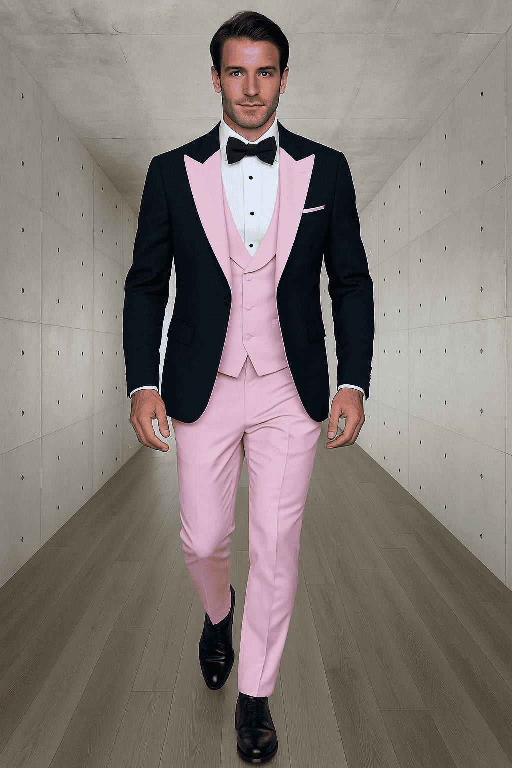 Men’s Black And Pink Wool Tuxedo – Designer Vested Tuxedo With Contrast Satin Peak Lapel For Wedding & Prom