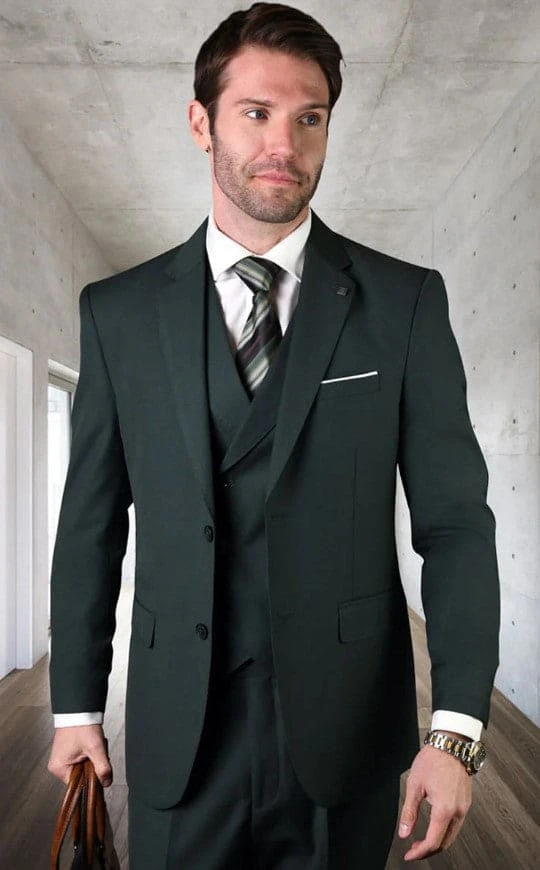 Men’s Vested Two Button Notch Lapel Modern Fit Solid Color Wedding Suit In Hunter Green