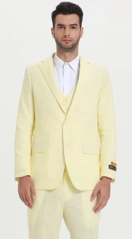 Men’s Notch Label Orange Colour Summer Seersucker Fabric Vested 3 Piece Suit