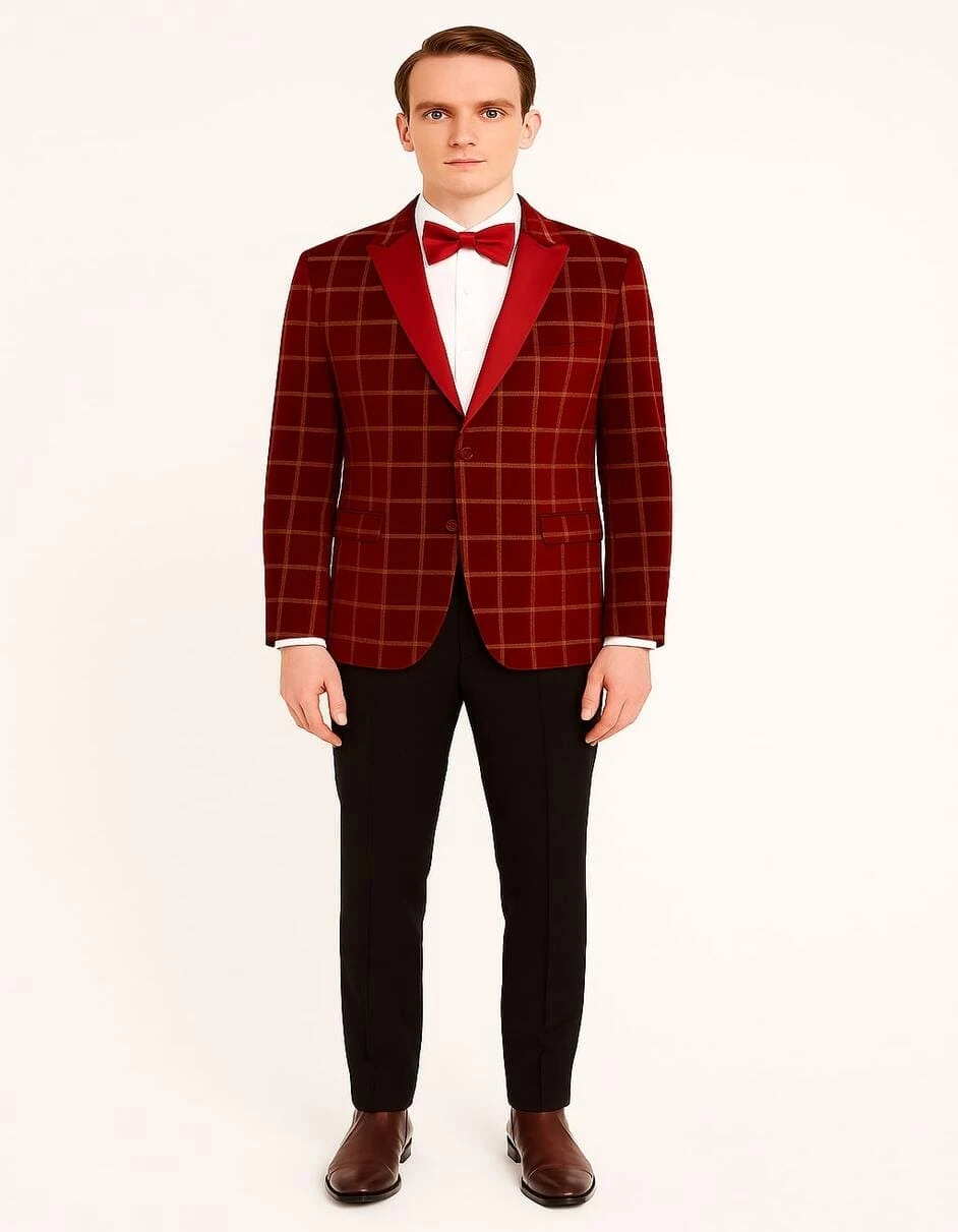 Make a bold impression with this elegant Men’s Red Velvet Plaid Blazer, designed to combine timeless tartan charm with modern luxury. The deep red velvet fabric features a gold-accented windowpane check pattern, making it a standout piece for festive occasions, holiday parties, weddings, and upscale gatherings.