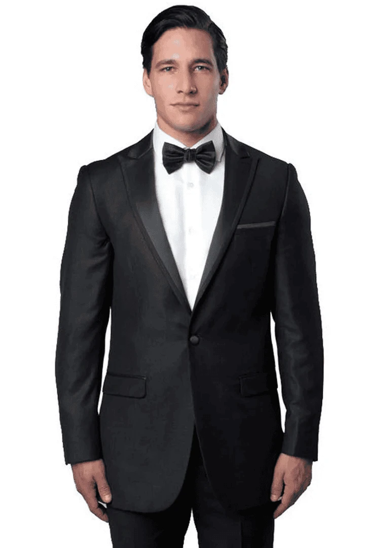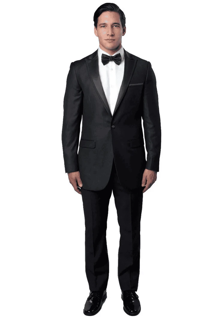 - This one summary slim fit tuxedo comes with a peak lapel with black satin trim, flat front pants, and side vents.