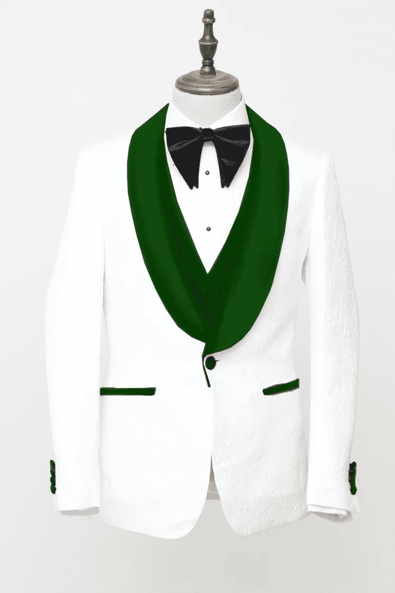 Men’s Vested White Paisley Wedding & Prom Tuxedo With Hunter Green Velvet Lapel