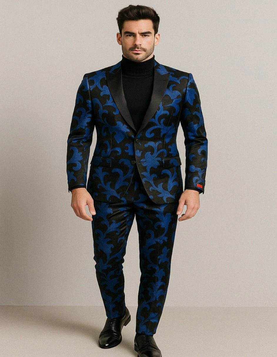 Command attention with this striking Men’s Black and Royal Blue Floral Tuxedo Suit, designed for men who embrace bold fashion with elegance. Featuring an intricate royal blue velvet floral embroidery on a deep black background, this two-piece suit is a powerful blend of sophistication and high fashion, ideal for weddings, proms, formal galas, and upscale evening events.
