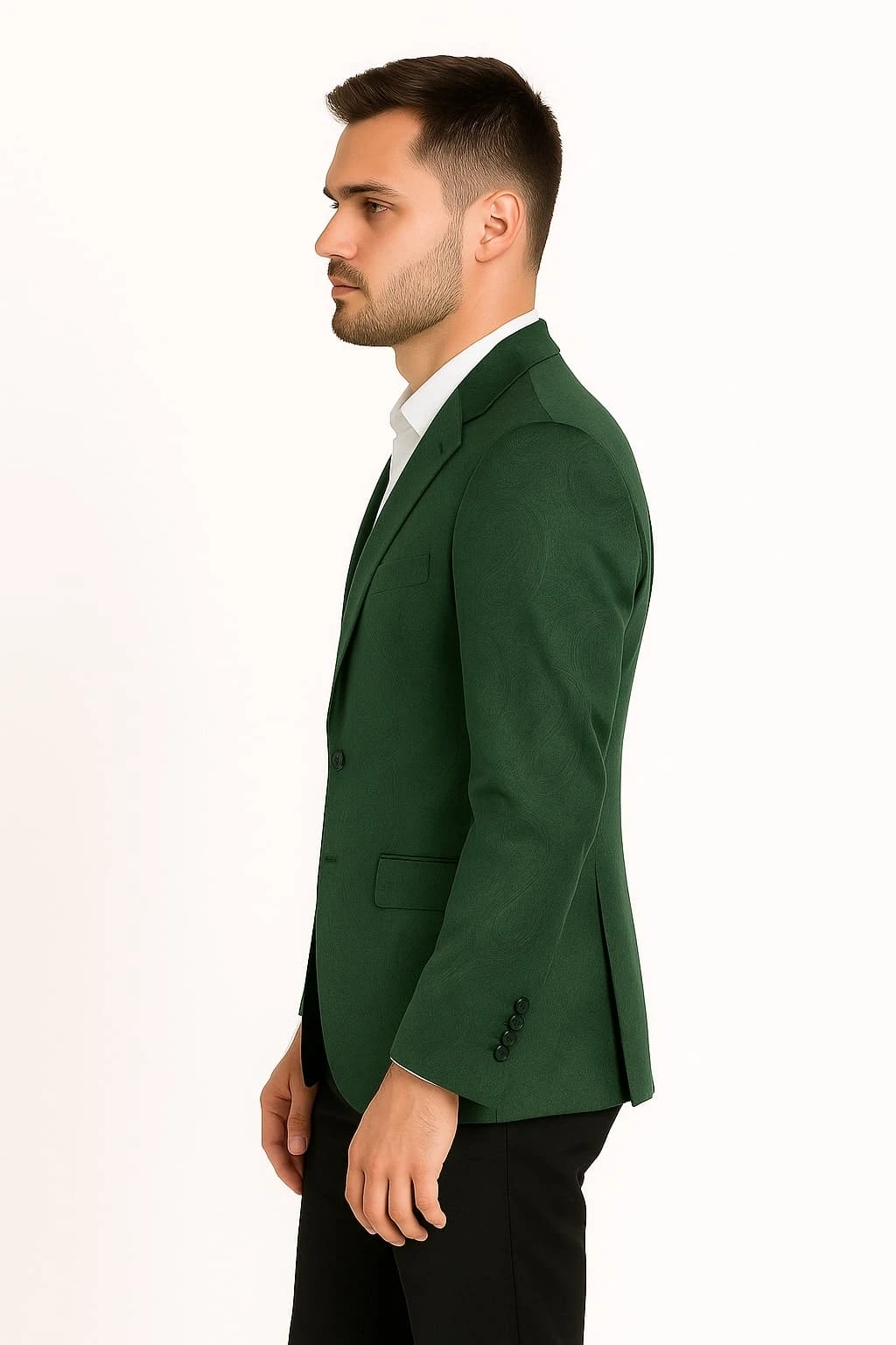 Command attention with this green paisley tuxedo jacket, an elegant choice for men who value refined detail and standout style. This slim fit blazer features a beautifully embossed paisley pattern throughout, offering a unique blend of texture and class.