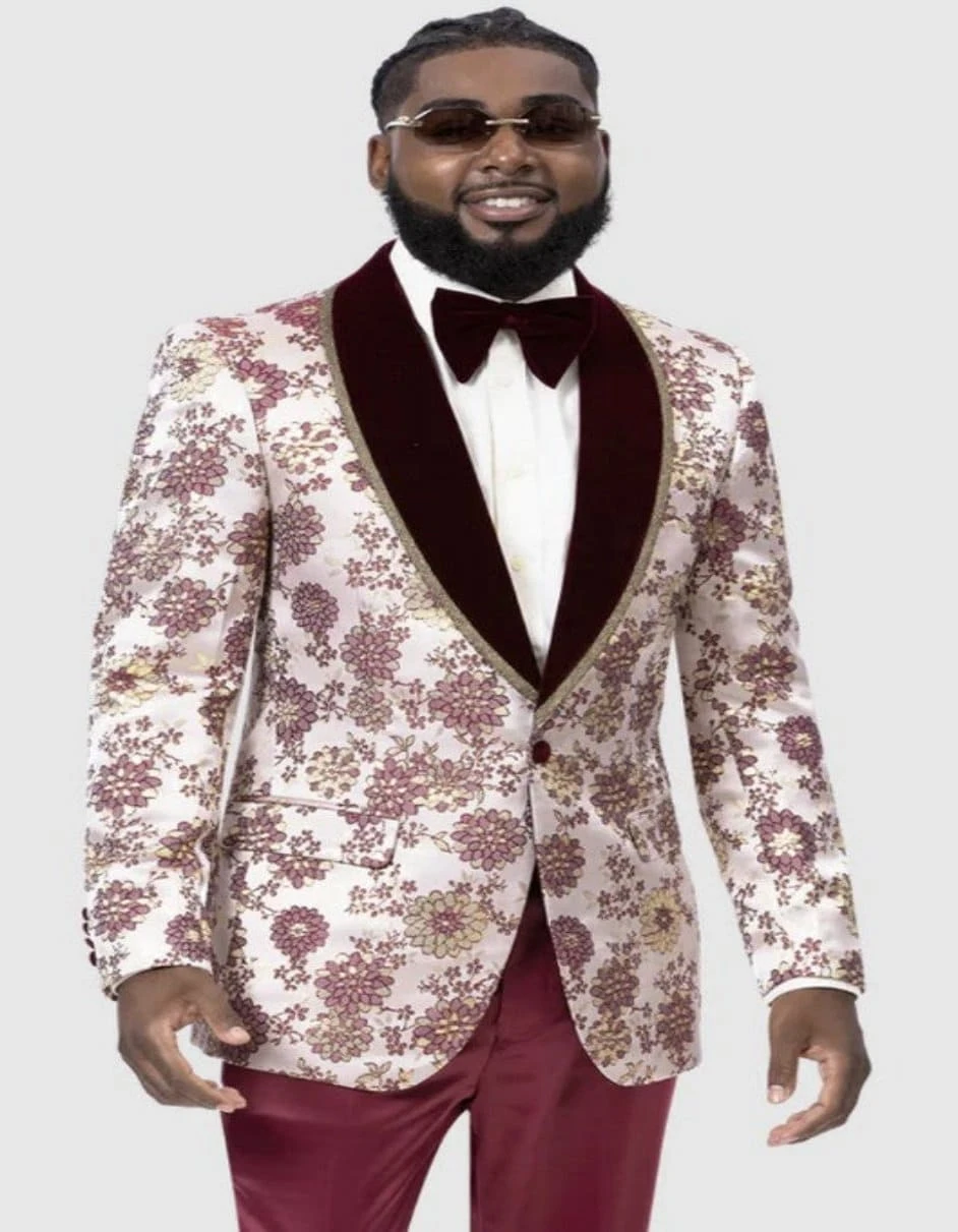 Mens One Button Shawl Label Burgundy And Gold Prom Tuxedo Dinner Jacket