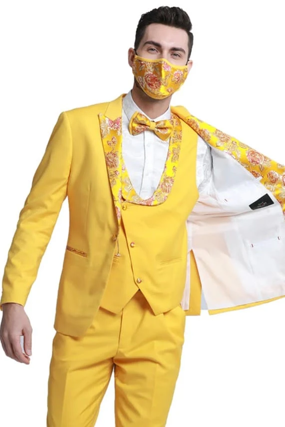 Mens One Button Vested Prom And Wedding Tuxedo Floral Peak Lapel Yellow Gold