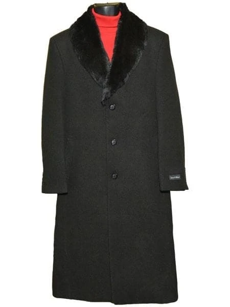 Mens Overcoat -Mens Long Wool Topcoats- Topcoat For Men-Men’s Dress Coat Fur Collar Black 3 Button Wool Full Length Overcoat