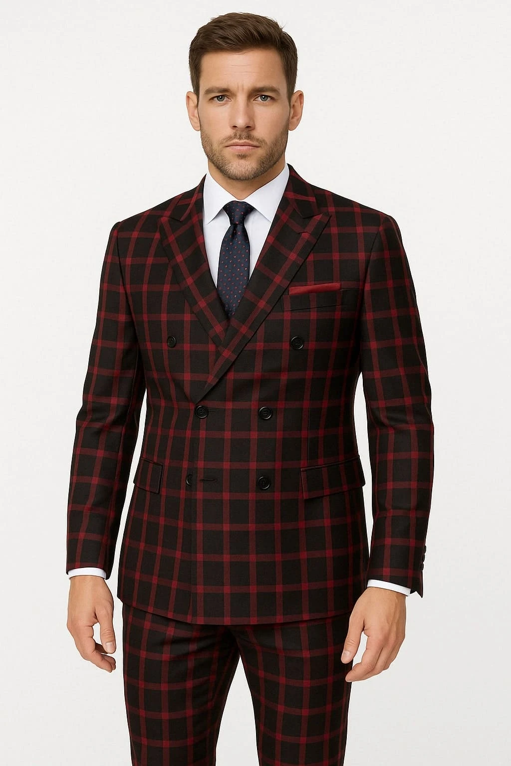 Make a powerful statement in this Men’s Red and Black Plaid Double-Breasted Suit, tailored for gentlemen who value bold, classic style. Designed with a deep black base and striking red checkered pattern, this suit brings timeless elegance into modern fashion.