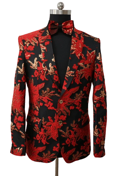 Black And Red Suit Men’s Modern Fit Velvet Floral Paisley Foil Tuxedo Jacket In Red & Black