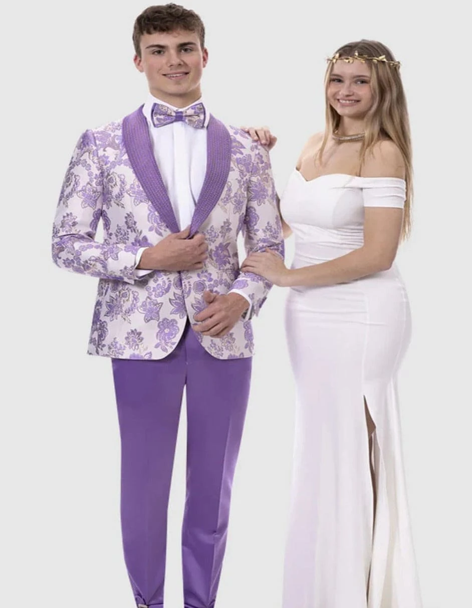 - This slim fit tuxedo features a 1 summary closure, studded shawl lapel, matching bowtie, and solid lavender pants.