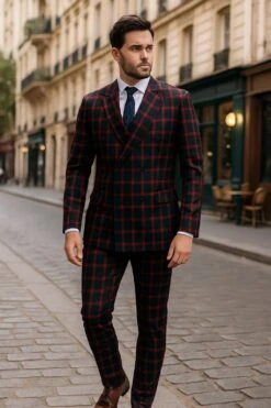 Mens Red And Black Plaid Double-Breasted Suit – Slim Fit Checkered 2 Piece Formal Business Outfit