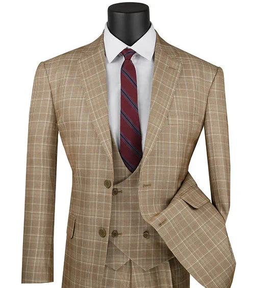 Regular Fit Camel Glen Plaid Three-Piece Suit