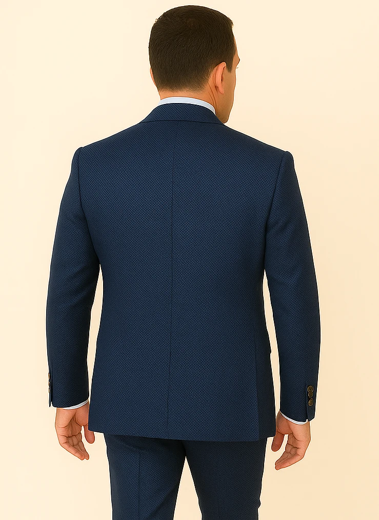 Rossi Man BOND RM1752 is a navy slim fit 3-piece suit with a 1-summary peak lapel jacket, double breasted vest, and flat front pants for a sharp, modern look.