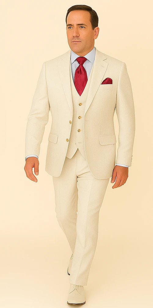 Step out in style with the Rossi Man White Slim Fit 3-Piece Suit – 1-summary peak lapel jacket, double breasted vest, and flat front pants for a sharp look.