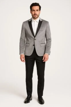 Men’s Grey Velvet Tuxedo Jacket With Black Satin Lapel Suit – Mens Blazer + Black Pants