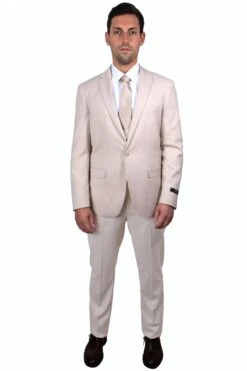 “Men’s Skinny Wedding Suit – One Button Peak Lapel With Lowcut Vest, Tan”